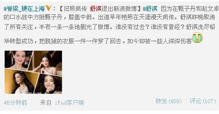 舒淇是国内著名的影视明星,去年闹得沸沸扬扬的甄子丹和赵文卓两个人的骂杖没有想到最先受到波及的居然是舒淇,这让很多喜欢舒淇的粉丝接受不了,而舒淇也愤然的关闭了微博,下面我们就一起来看看舒淇退出微博的始末 舒淇删微博