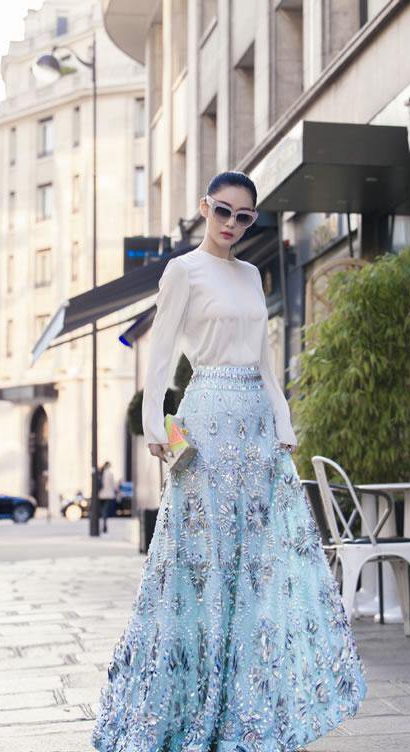 倪妮参加2014春夏巴黎时装周 一套蓝装霸气侧